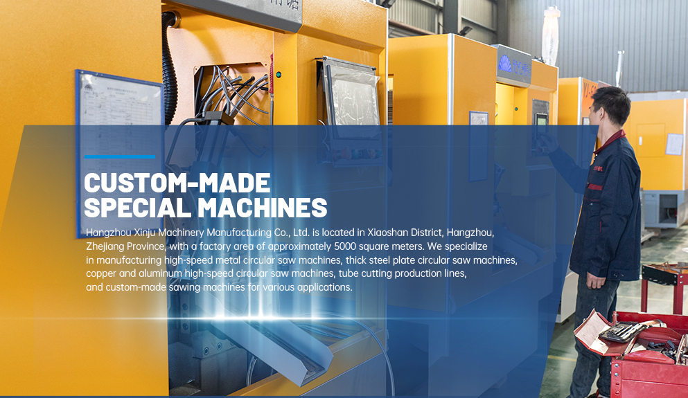 Hangzhou Xinju Machinery Equipment Manufacturing Co., Ltd.is situated in the Industrial New District of Heshang Town, Xiaoshan District, Hangzhou, Zhejiang Province, enjoying convenient transportation and a beautiful environment. With a factory area of approximately 5000 square meters, we specialize in producing high-speed metal circular saw machines, thick steel plate circular saw machines, copper and aluminum high-speed circular saw machines, tube cutting production lines, ...